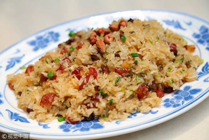 将腊味、虾米、色泽鲜亮的酱油等爆香后添入香葱,拌进糯米饭中,既好看又好吃。