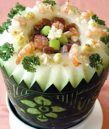 冬瓜盅是地道的广式菜肴,能养胃生津、清降胃火。在冬瓜盅里加入一些什锦配料,更添鲜味。对于注重口味,更注重养生的广东食客来讲,大鱼大肉吃多了,清腻养胃最好不过。