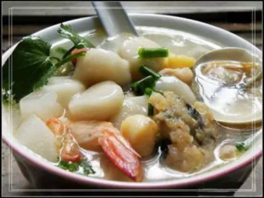 阳江新春美食多,如黄鬃鹅、蒲圆子、煎糍(煎堆)、发糕(松糕)、油角,还有各种美味海鱼海鲜……其中以海鲜咸汤圆即“蒲圆子”独具特色。