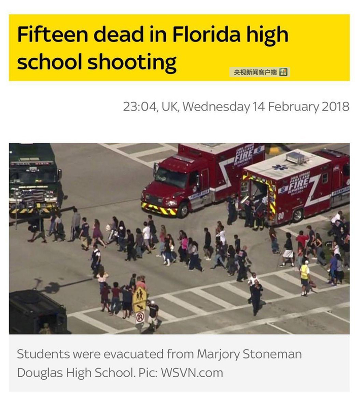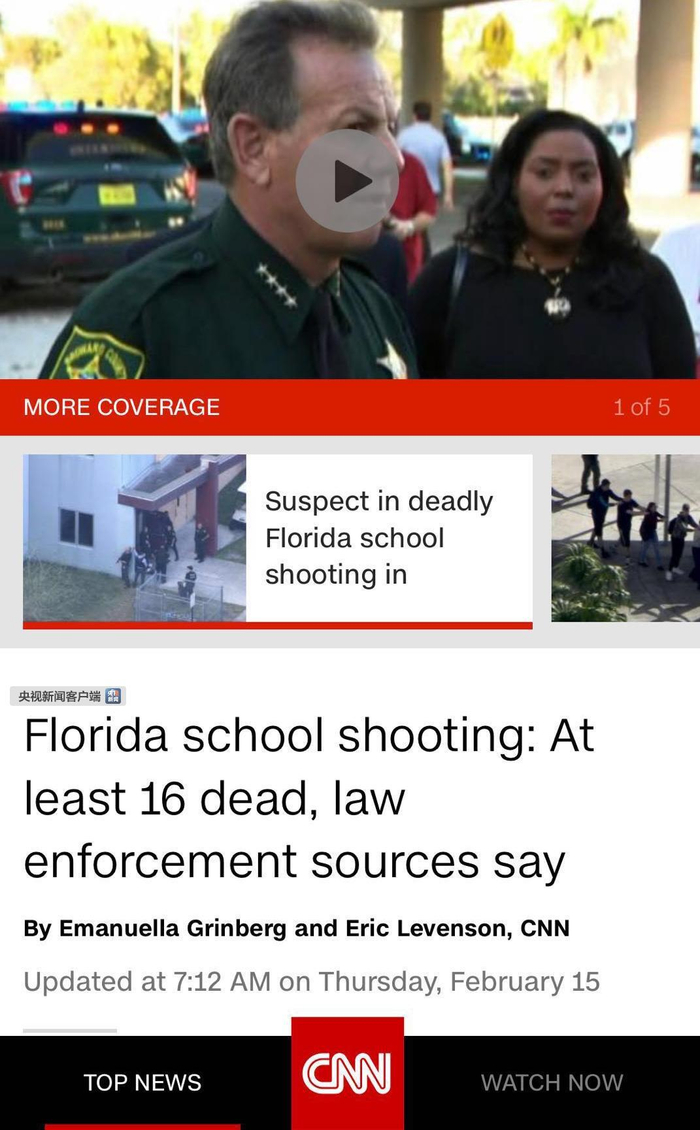 据CNN快讯:佛罗里达发生校园枪击案,已造成至少16人死亡。(央视新闻客户端编译)