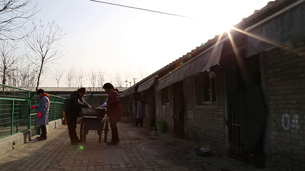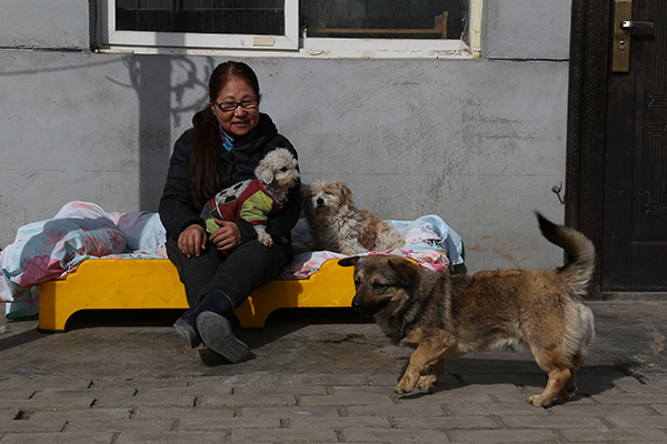 2月10日中午,蒋宏与救助的小狗们在院子里晒太阳。