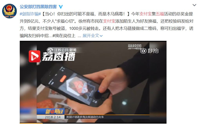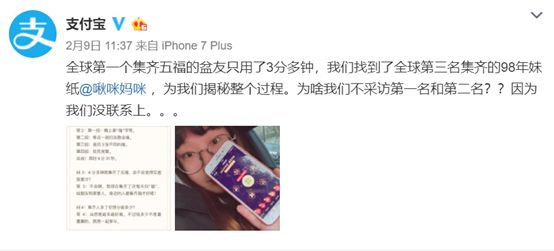 支付宝官方还表示,在大年三十(2月15日)这一天,共有2018万张万能福送出,并且鼓励已经集齐五福的人将万能福送给亲友,让更多的人集齐。
