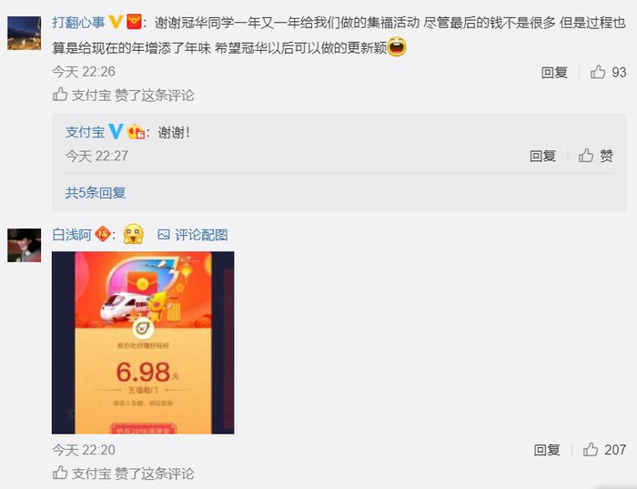 有人甚至说,贴福字是旧年俗,扫福卡才是新年俗。不过支付宝集五福的玩法到底坑不坑,明年还有没有必要继续下去,最终还得网友们说了算。