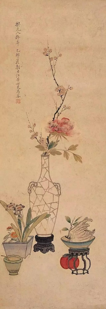 所以画家在创作节日、礼俗类题材的清供画时,除了艺术形式以外,还要考虑如何通过各种物象的配搭传递出吉祥寓意。