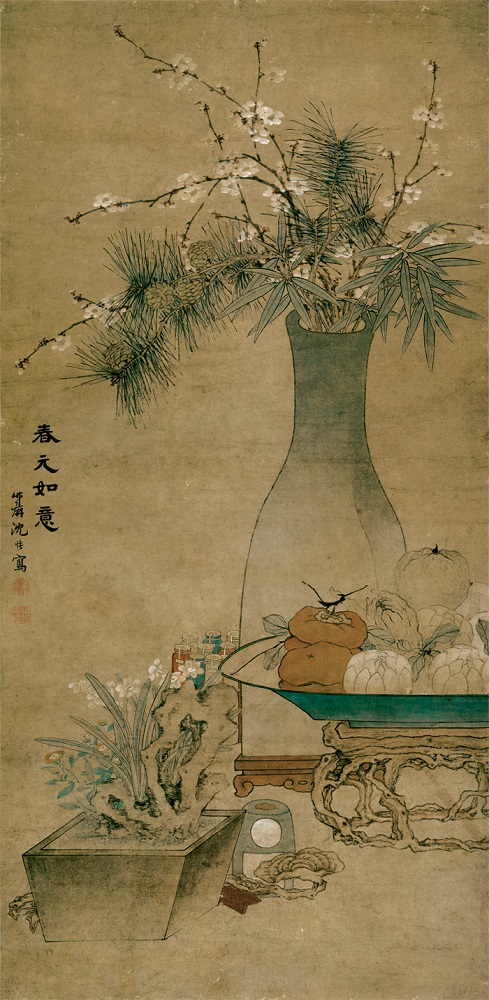 清时吴县画家沈俊,善写花卉翎毛,设色雅静,风韵不凡,他的《岁朝清供图》画的是柏结子,梅破蕊,茶瓶清供,晓窗迎新。画外自题曰:“柏子香中霁日妍,一瓶清供晓窗前。玉梅破蕊先含笑,春色今年胜旧年。”很有祈福纳祥之意。