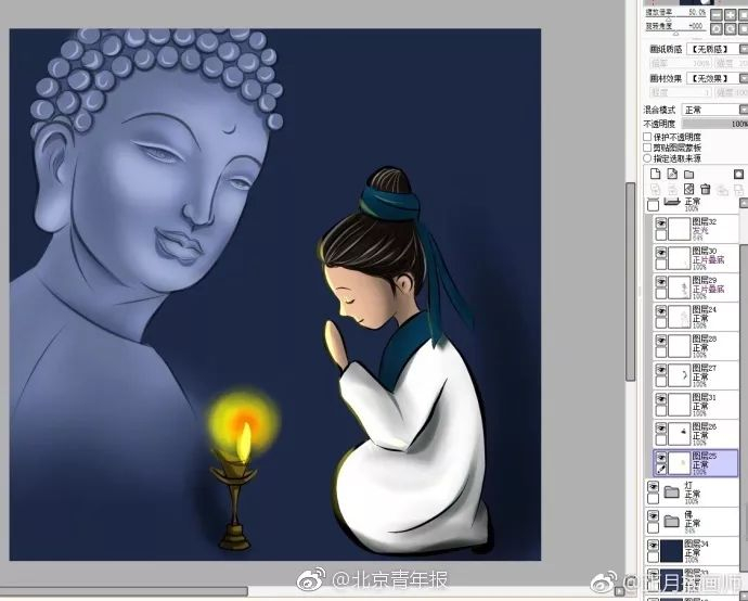 “这张图的原创就是我,我怎么不知道有这个功效?!”原来这幅画是在2017年6月份画的,当时只是想画一个很虔诚的在夜晚的灯前念经的古人,不出自任何典故也没有任何寓意。佛像就只是照着释迦牟尼的像画的,也不是画的地藏菩萨。@正月插画师 表示:“作为一个原创插画师,本人最讨厌的就是迷信。祝福是好的,图片没有这个功效。拜托不要拿人家的心血去做迷信的事。对于原出处,我只能说,利用大家的孝心,太缺德了!”