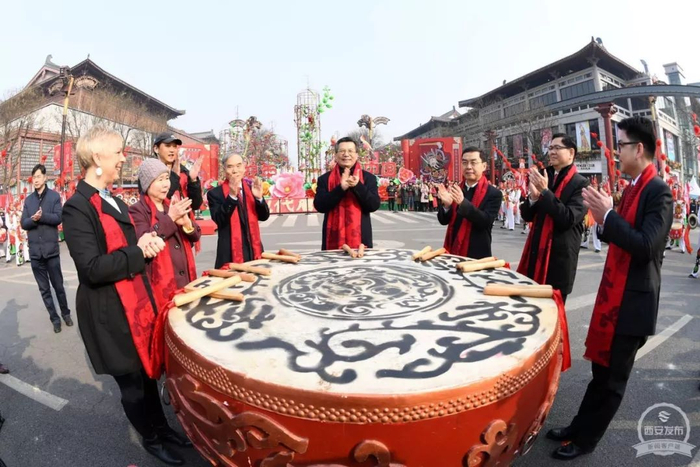 2月16日大年初一上午,2018“西安年·最中国”大唐不夜城“现代唐人街”开街暨“春临长安·福喜盈门”大拜年活动在曲江隆重举行。省委常委、市委书记王永康,市长上官吉庆出席。(西安发布)