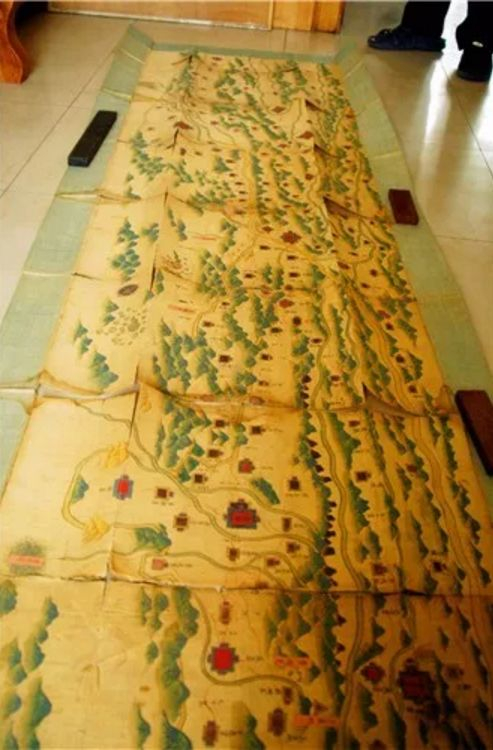 仔细地将地图全部展开后,记者看到这幅地图将近有5米长,地图宽约80公分,整个地图用矿物颜料绘制而成,用不同的色彩来代表不同地形及城镇。