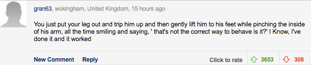 “我有办法,你伸腿把熊孩子绊倒,然后用手把他抱起来,同时还有用力掐他胳膊的内侧,同时脸上要面带微笑地说‘这可不是一个好孩子该做的事儿哦!’我这么试过,很有效!”