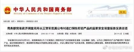 16日,美国商务部公布对美国进口钢铁和铝产品的国家安全调查(232调查)报告,并建议特朗普对进口钢铁和铝产品实施进口限制措施。中国商务部贸易救济调查局局长王贺军17日表示,如果美国最终的决定影响中方利益,中方必将采取必要措施维护自身正当权利。
