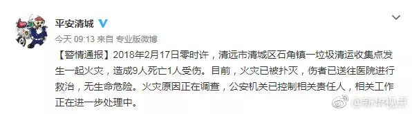 17日,广东清远市清城区石角镇一垃圾清运收集点发生一起火灾,致9死1伤。目前,火灾已被扑灭,伤者已送往医院救治。经查,火灾系因残余烟花爆炸,死者为工作人员及家属。