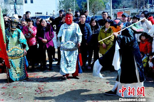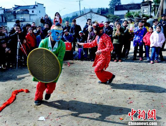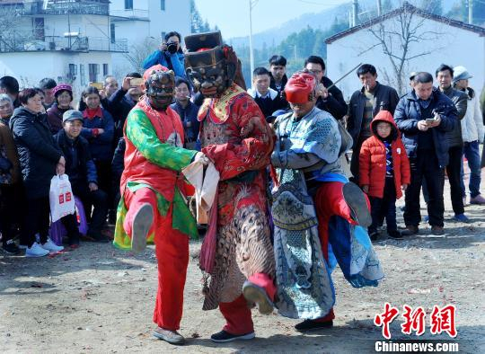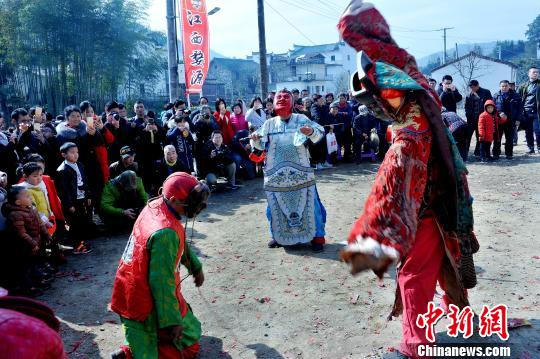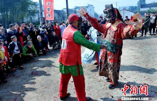 2月17日,江西省婺源县秋口镇长径村表演的请傩神、跳傩舞的傩事活动,吸引了众多群众和游客观看。 卓忠伟 摄