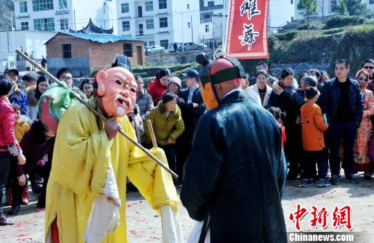 2月17日,江西省婺源县秋口镇长径村表演的请傩神、跳傩舞的傩事活动,吸引了众多群众和游客观看。据了解,被誉为国家级非物质文化遗产江西省婺源县秋口镇官桥长径傩舞起源于南唐,至今已有1050年历史,被称为中国“戏曲活化石”。每年正月大年初二开始,当地村民们都会以请傩神、跳傩舞方式,祈盼风调雨顺、五谷丰登。