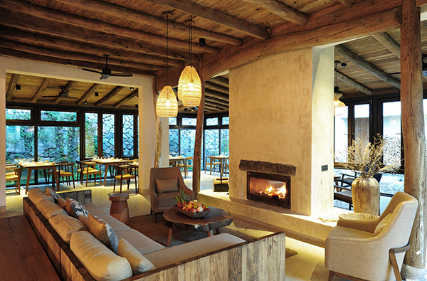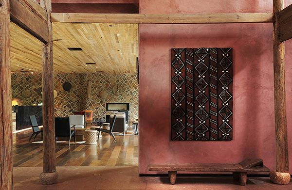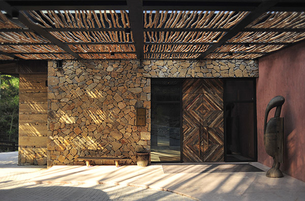 裸心堡保留了原初的地貌植物,如果你见过之前的老照片,很多细节让人感动。本来是农舍的地方建起了错落的平房,你仍然可以在原始的山道上漫步,清翠的山涧穿过层叠的建筑群淙淙而下……从半山的巨型雕塑前下车,沿着挑空的栈道步行上山,这是我心仪的进入,一路且走且停,品味着竹、石、木、土、钢、玻璃的起承转合,进入接待中心,非洲大地与中国乡居在这里共冶于一室。
