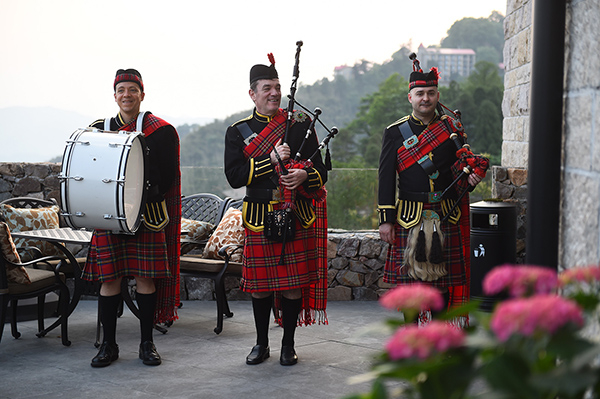 裸心堡开张时,身穿苏格兰服装的外国人在演奏音乐