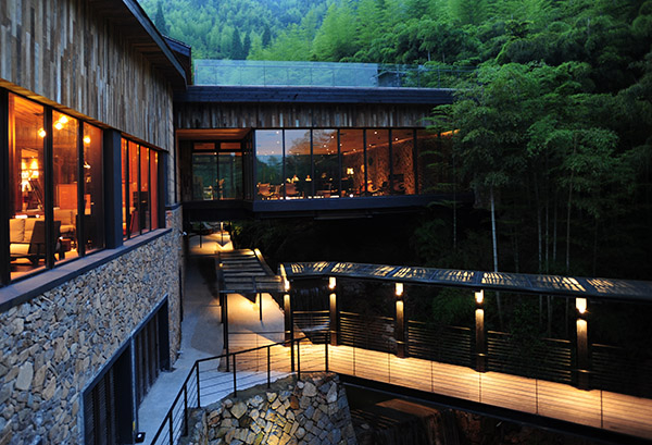 在吕晓辉的设计理念里,建筑应该尊重场地原有的脉络,需要设定明确的“边界”。“大部分村子建在山林和农田之间的那块土地上,这个就是边界。在整个设计和改造过程中,如何让边界不被破坏,这点很重要。有时候,城市的建筑被直接移到乡村,其实是‘跨界’了,好像你出了城又进了城。”在裸心堡,原来的民房无法承担接待中心所需的较大空间,吕晓辉通过玻璃与钢结构,延伸了原来的空间,化解了边界带来的限制。溪流从下方穿过,翠竹和步道相依,建筑如同生长在这里一般。