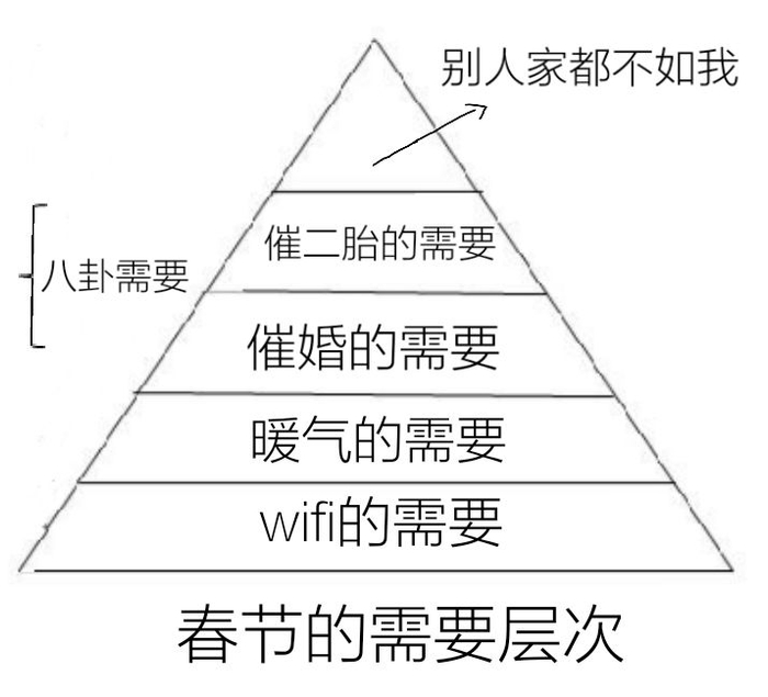 而七姑八姨春节期间的需要层次除了Wi-Fi、暖气等物质需要之外,还有催婚、催生等精神需要,可统称为八卦的需要。
