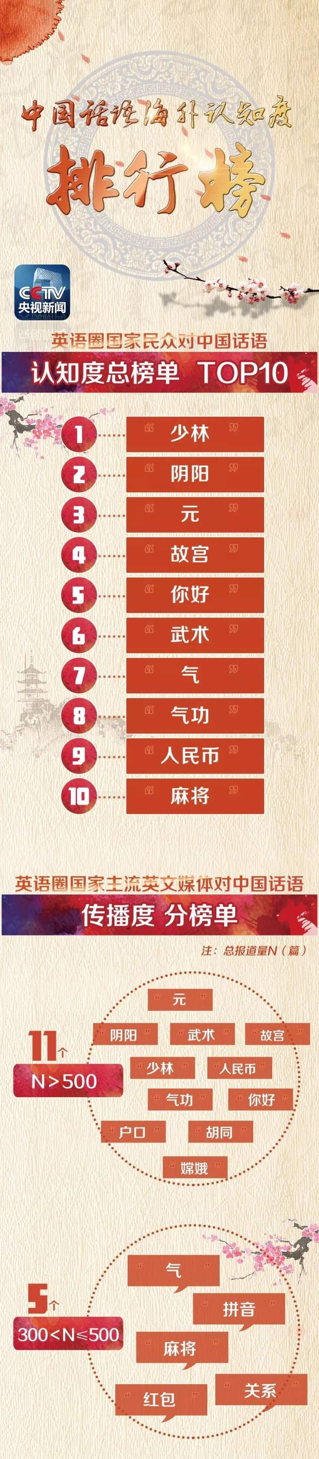 在认知度排在前100名的中国词中,文化类的词语所占比重最大,像春节、重阳等中国传统节日悉数上榜,而排名最靠前的还是非中国功夫莫属,“少林”一词高居榜首。