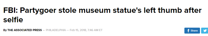 美国联邦调查局公布,该展去年在美国费城展出时,有一名24岁的美国青年偷溜进已闭馆的博物馆中,折断了其中一个兵俑的手指,并将其藏在口袋里带走。