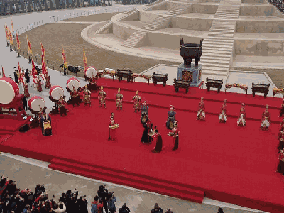 活动现场,通过演绎迎驾、静鞭、行礼,鸣钟、列阵、行进,初献、亚献、终献等环节,完整复原了唐代春节天坛祈福大礼全过程。