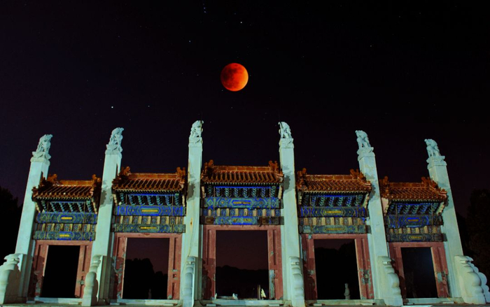 2018年1月31日,河北遵化。“ 超级蓝血月全食”在清东陵天幕现身。张国华 摄