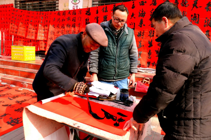 2018年2月14日,陕西宝鸡。大年二十九,陕西宝鸡街边,书法爱好者现场为过往行人书写春联,延续人们年三十贴春联的传统习俗。王镝 摄