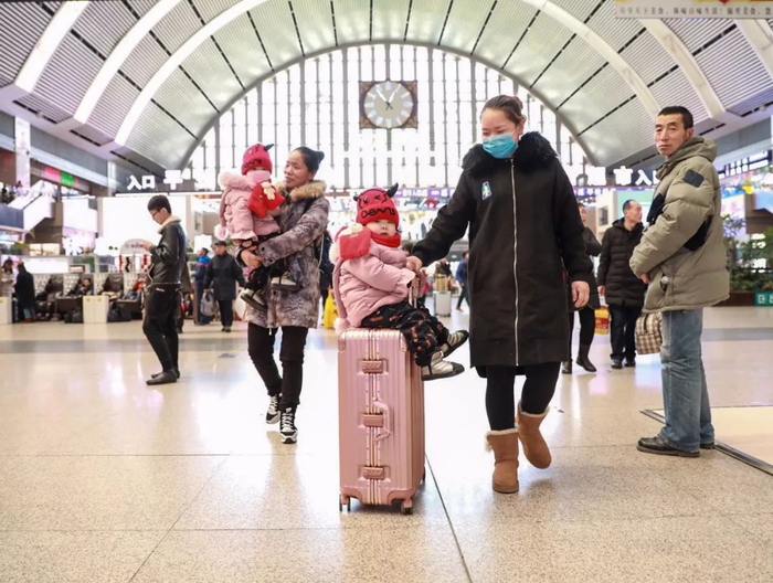 2018年2月16日,辽宁沈阳。沈阳火车站内,一对双胞胎在姥姥和妈妈的护送下回家乡过年。福星金刚 摄