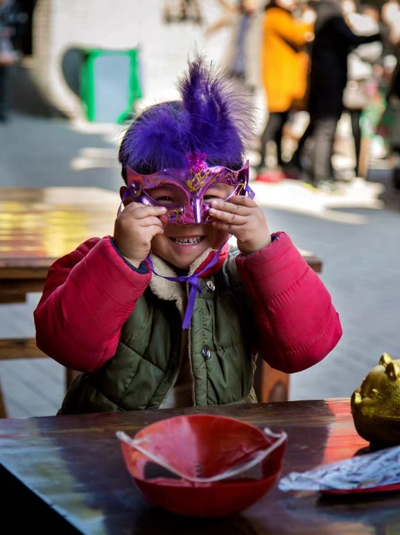2018年2月16日,郑州千稼集。郑州千稼集庙会上戴着卡通面具的小男孩。喜洋洋 摄