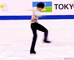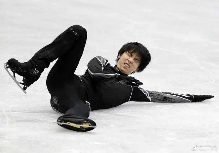 一般人可能要哭爹喊妈送医院了,羽生不,他包扎了一下就坚持比赛,这一下就是五连摔↓