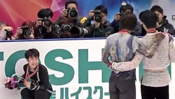 那是2015年的日本大奖赛,金博洋摘得男子单人滑亚军。赛后的合影环节,摄影记者正在拍摄夺冠的羽生结弦和获得季军的另一位日本选手无良崇人。见此情景,金博洋笑着蹲在了挡板前面。
