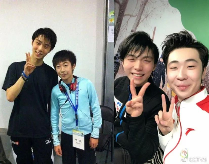 金博洋和他的偶像羽生结弦合影,左边为2011年中国杯花滑锦标赛,那一年,金博洋14岁,羽生17岁。右边为本届平昌冬奥会。