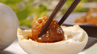 红油就像爆浆一样,顺着蛋壳流淌。