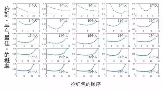 最佳手气的概率在5个人抢的时候是依次递减的。