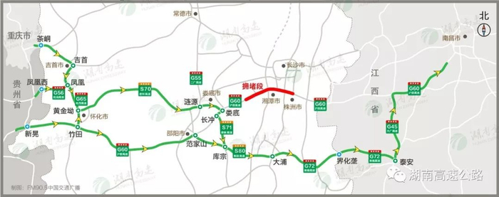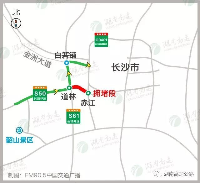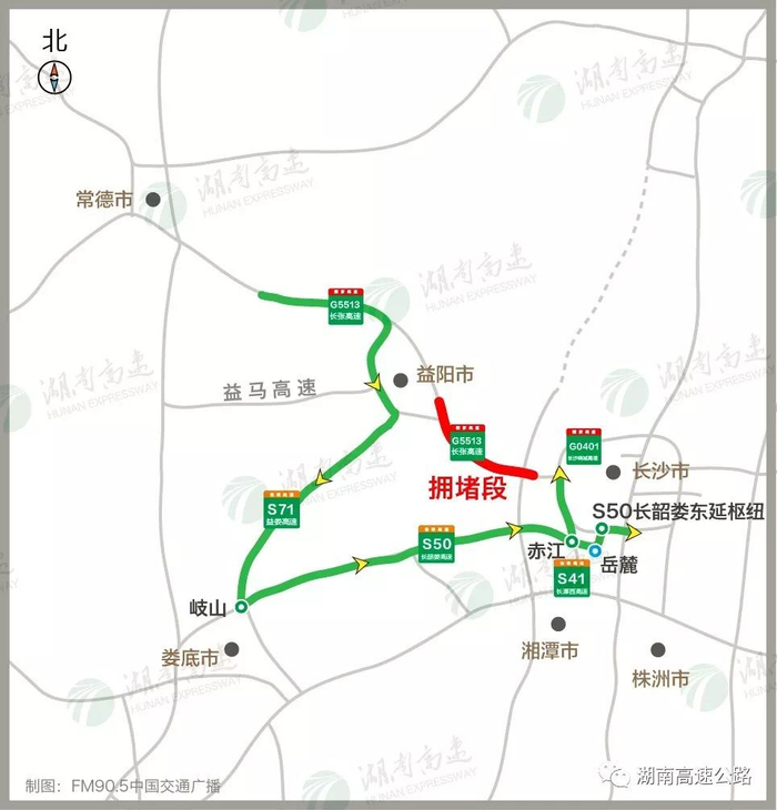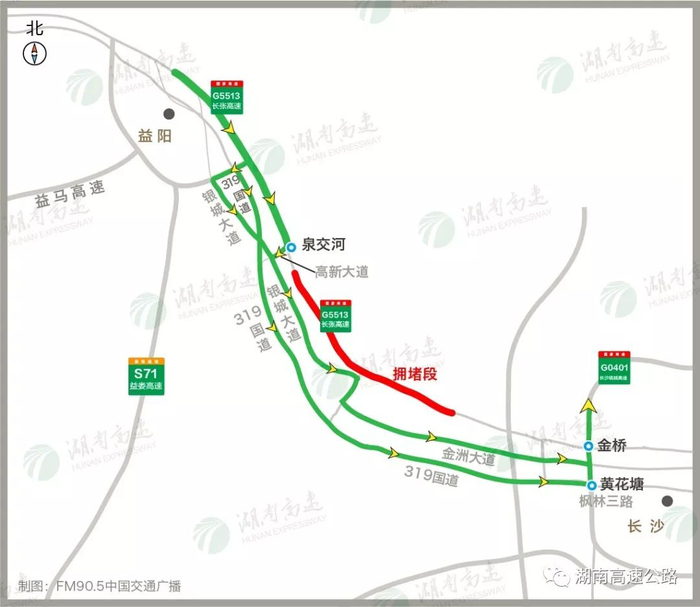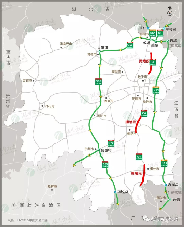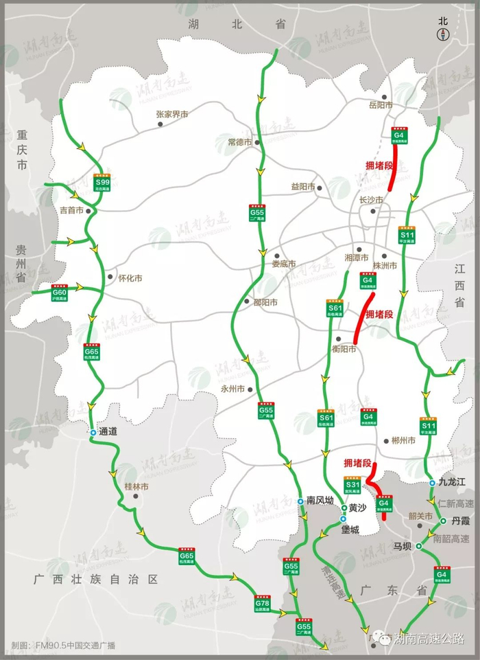 G4京港澳、G55二广、G65包茂、S11平汝北往南方向和G60沪昆西往东方向等主要通道;G5513长张高速益常段西往东和长益段双向、S50长韶娄高速全线尤其是道林段双向、S41长潭西高速学士枢纽至赤江枢纽出城方向、S80衡邵高速西往东方向、S61岳临岳阳段和湘潭段北往南等省内区间;梽木山、大浦、炎陵西、新开、龙湾、石家寨、石门桥、简家坳、殷家坳、凤凰等高接高枢纽以及各路段沿线服务区发生缓行和拥堵现象的概率将显著增加。