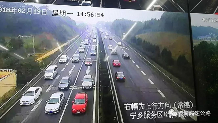 △2月19日,宁乡服务区(西往东方向)。 今日实时监测数据显示全省路网流量较前日还将大幅攀升,预计在20日(初五),返程车流处于井喷态势,当日路网流量或将抵达春运峰值。