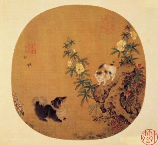 其中,李迪的《秋葵山石图》与无款《秋葵犬蝶图》表现了小狗们扑蝶逗猫的场景。《秋葵犬蝶图》中一只小狗在山石花草中仰视蝴蝶,小狗抬头翘尾,姿态可人,空中蝴蝶翩翩飞舞,一派恬静安逸。以此看出画家的心思缜密,细致入微。而在李迪《秋葵山石图》的画面里,小狗追捕蝴蝶无果,反过来戏弄太湖石上的三色狸猫;狸猫对于这突如其来的挑衅,猝不及防,瞬间弓背竖尾、毛发炸开。如此细微的一瞬间,使人不得不钦佩作者敏锐细致的洞察力。这两幅作品都是典型的南宋院体花鸟画,构图空灵,用笔细致,造型准确生动,设色典雅明丽。小狗与狸猫、蝴蝶自然真实、活泼可爱,右侧所画秋葵,花朵洁白、枝叶茂密,花叶用色层层渲染,画风纯净清丽。