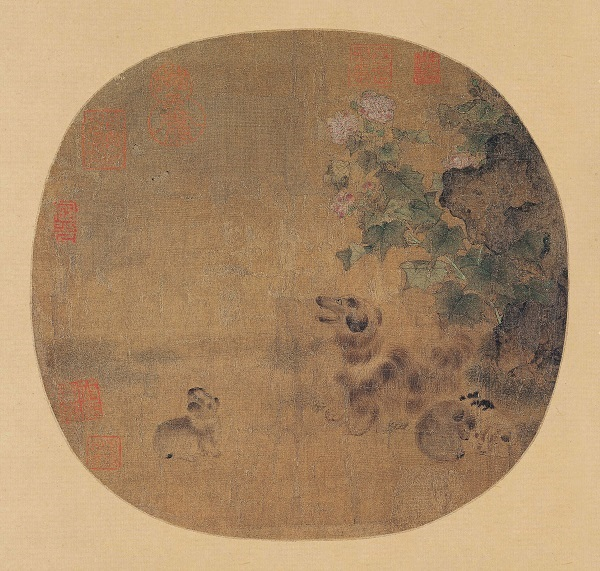 到了宋代,小型观赏犬更是宫廷绘画的表现题材。从南宋小品团扇中就可知晓,如毛益的《萱草戏狗图》与李迪的《秋葵山石图》,以及南宋无款的《秋庭乳犬图》、《秋葵犬蝶图》、《鸡冠乳犬图》、《萱花乳犬图》等,这些都画的是十分可爱的小型观赏犬。