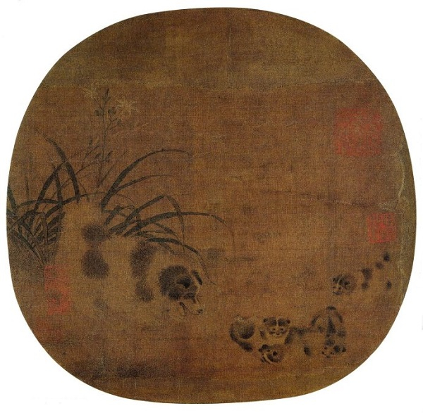 宋人小品画有很多题材,其中表现宠物犬的画作就有不少,尤其是宫廷贵妇在闲情逸致之时所驯养的小型观赏犬。毛益的《萱草戏狗图》与李迪的《秋葵山石图》,以及南宋无款的《秋庭乳犬图》、《秋葵犬蝶图》、《鸡冠乳犬图》、《萱花乳犬图》等就是典型代表。既反映了南宋院体花鸟画技艺的高超,又显现出画作中宠物犬的生动传神。千年之隔,犹如昨日。