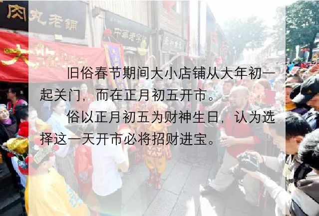 各个店铺迎财神:各个店铺闻鸡鸣即起,开始接神,放鞭鸣炮,在招幌上挂红布,庆祝开市大吉,共喝财神酒。