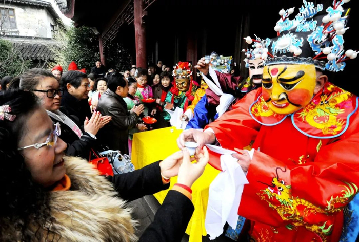 2017年2月1日,在江苏苏州古山塘街,“财神”向商户敬“路头酒”。新华社发(王建中 摄)