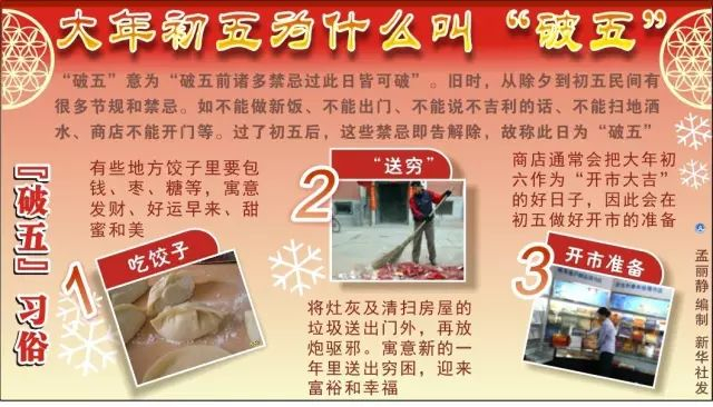 农历正月初五,俗称“破五”。民俗专家解释说,“破五”是送年的意思,过了这一天,一切就慢慢恢复到大年三十以前的状态。
