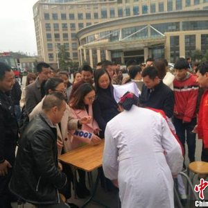 2月20日,在江西省赣州市宁都县人民医院门口,爱心人士排队为受伤人员义务献血。 李斌 摄