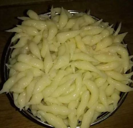 秦人老少皆能作,依凉水加白矾将豆粉搓成硬团,后以凉水和成粉糊,使其有韧性。锅水开沸,粉糊徐徐倒入,搅,粉糊熟透,压火,以木勺着底再搅,锅离火,取漏勺,盛之下漏凉水盆内;“鱼”,则生动也。