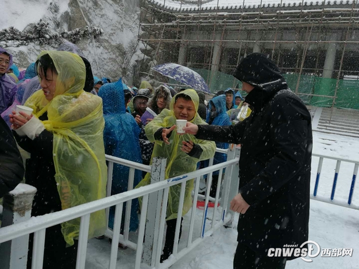华山景区突降雪,景区启动应急预案疏导游客有序下山。