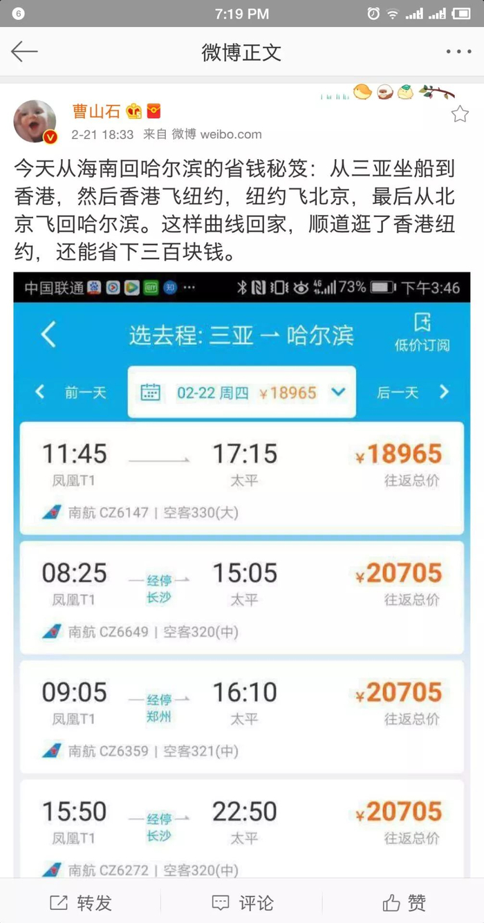 有网友甚至计算得出,从三亚回哈尔滨,最省钱的办法竟然是绕道半个地球经停纽约。