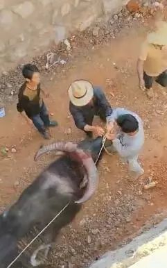 此时水牛有些“耍脾气”,慢腾腾地不愿意往前走,身着灰色衣服的男子便使劲拽着牛鼻绳,强行拉着水牛走,没想到它走出几米远后突然发狂,先将牵着它的男子撞翻。