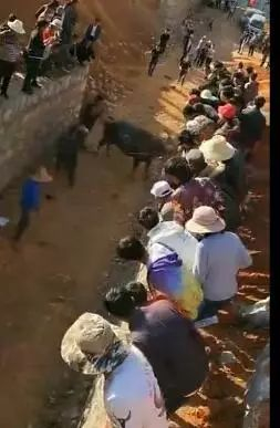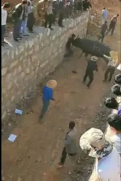 云南一斗牛发狂把人顶到墙上,脚离地1米高…视频超恐怖!