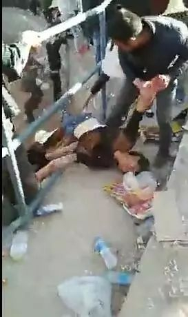一名身着黑T的男子迅速从看台上跳下,将伤者移动到场地内。从视频中可以看到,黑衣男子躺在地上一动不动,周围血迹斑斑,看来伤势不轻。