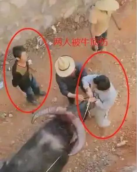 后面的黑衣男子见状,忙上前想拉住发狂的水牛,不想竟被它当成了攻击对象,于是出现了开头那一幕。