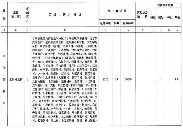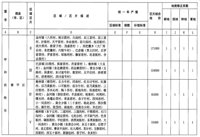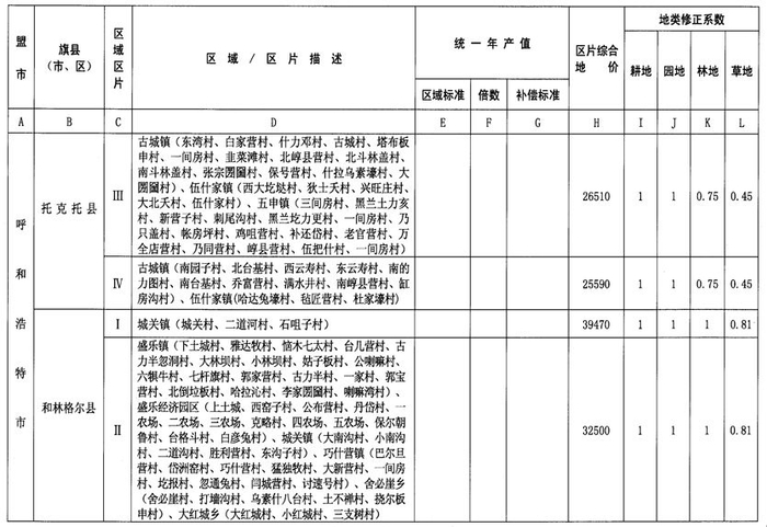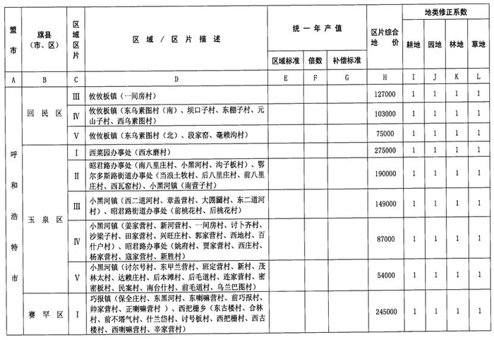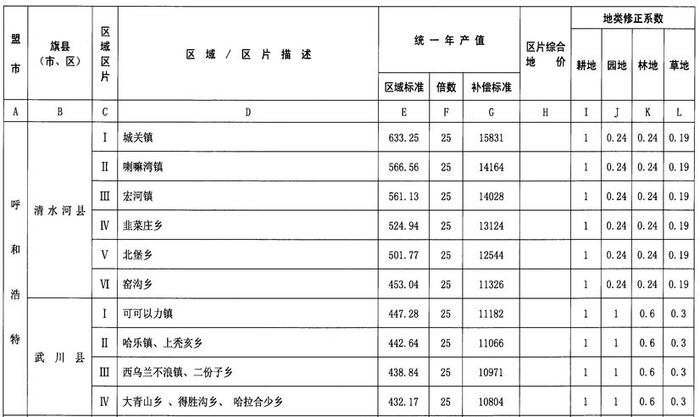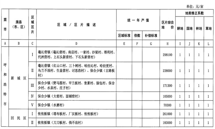 内蒙古自治区人民政府办公厅关于公布自治区征地统一年产值标准和征地区片综合地价的通知